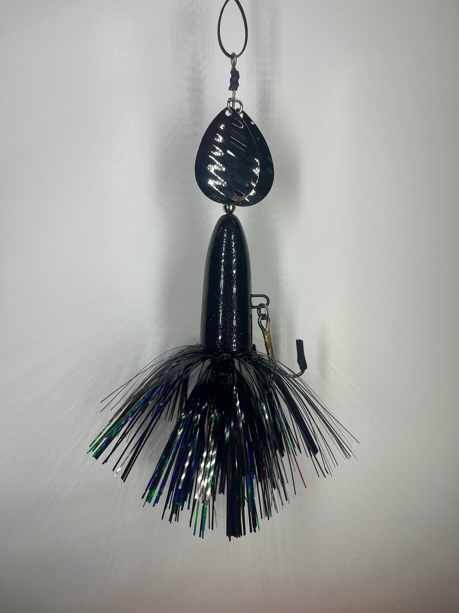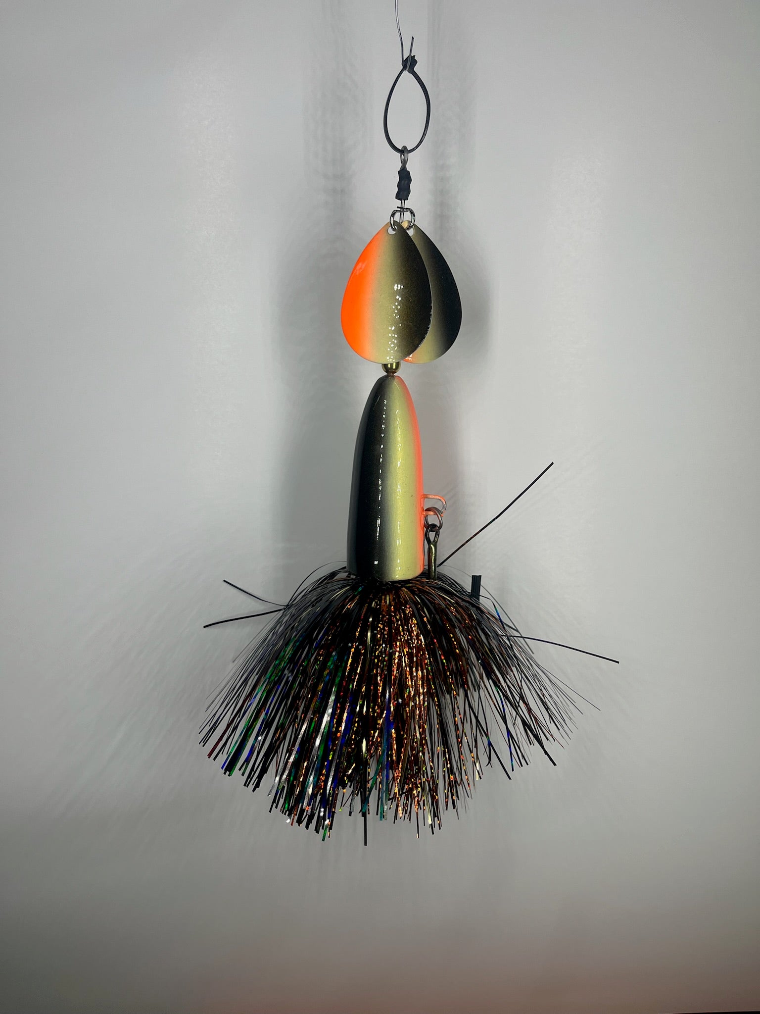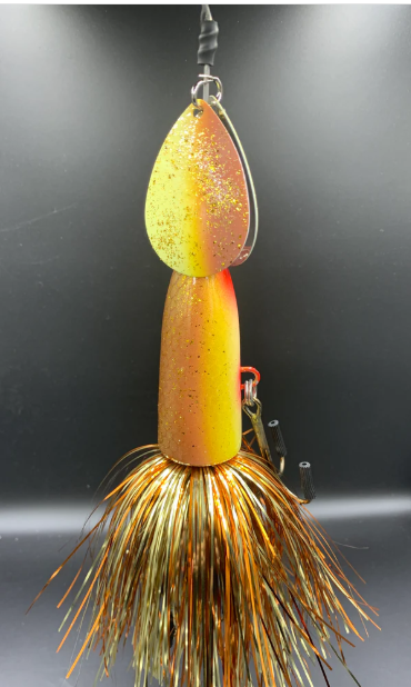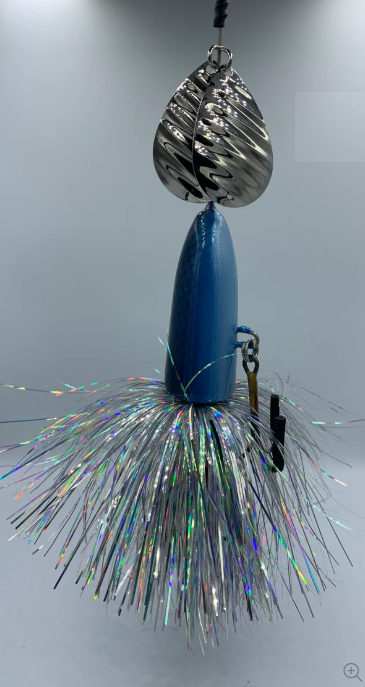 The High Rollers we’re our first hardbody in-line bait designed to be used where traditional inline spinner baits have a hard time preforming. We designed them to be fished slow over Weedbeds or in very shallow water and not get Fowled up. High Rollers have become a staple in the Handlebarz line up. These baits have a solid body with a though wire we use the same 0.062 stainless steel wire that are on our other baits. These baits have two size 8 magnum blades and two 5/0 VMC treble hook they are finished with a flashabou hand tied by us. Starting spring of 2025 all High Rollers will also have the threaded insert so that you can use them as originally designed or screw weights into them and use them deeper in the water column. Adding the weights help keep line twist when trolling these baits.