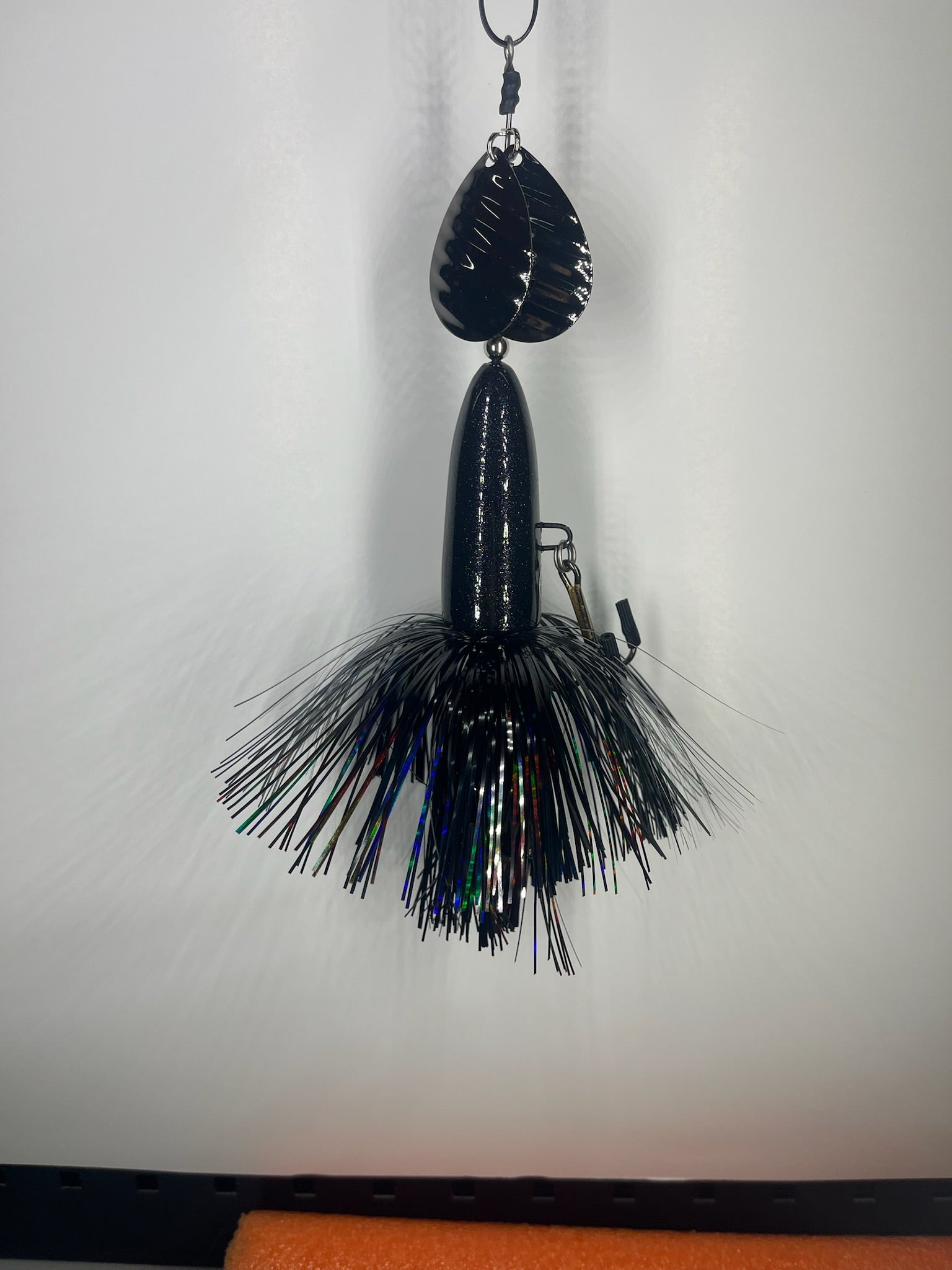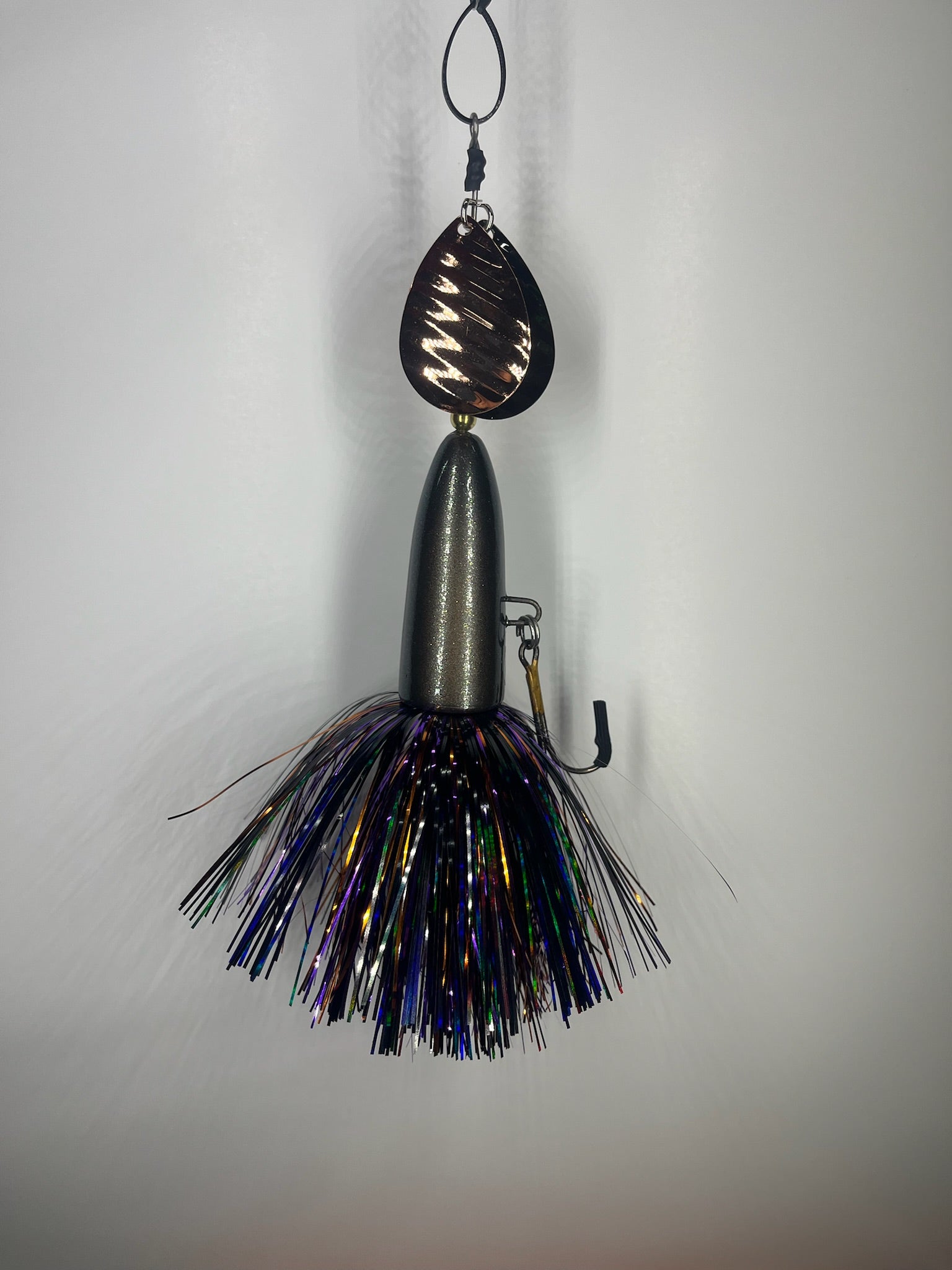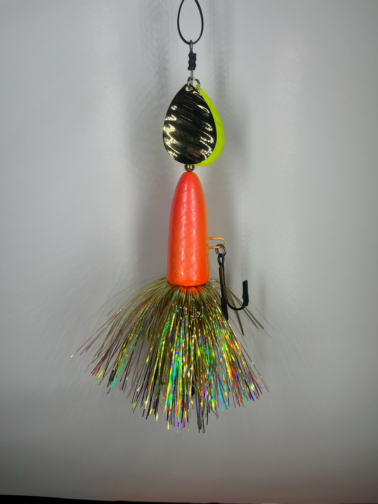 The High Rollers we’re our first hardbody in-line bait designed to be used where traditional inline spinner baits have a hard time preforming. We designed them to be fished slow over Weedbeds or in very shallow water and not get Fowled up. High Rollers have become a staple in the Handlebarz line up. These baits have a solid body with a though wire we use the same 0.062 stainless steel wire that are on our other baits. These baits have two size 8 magnum blades and two 5/0 VMC treble hook they are finished with a flashabou hand tied by us. Starting spring of 2025 all High Rollers will also have the threaded insert so that you can use them as originally designed or screw weights into them and use them deeper in the water column. Adding the weights help keep line twist when trolling these baits.