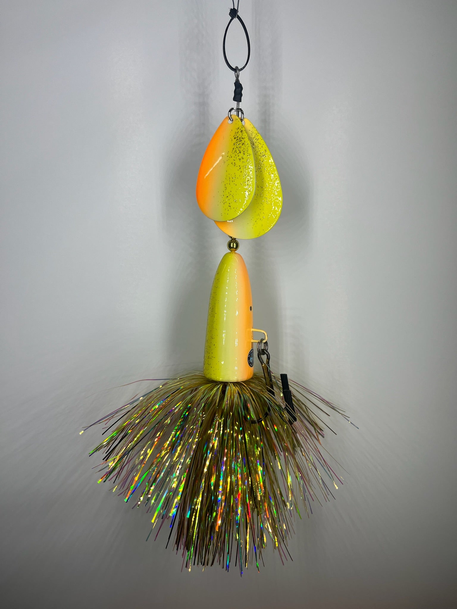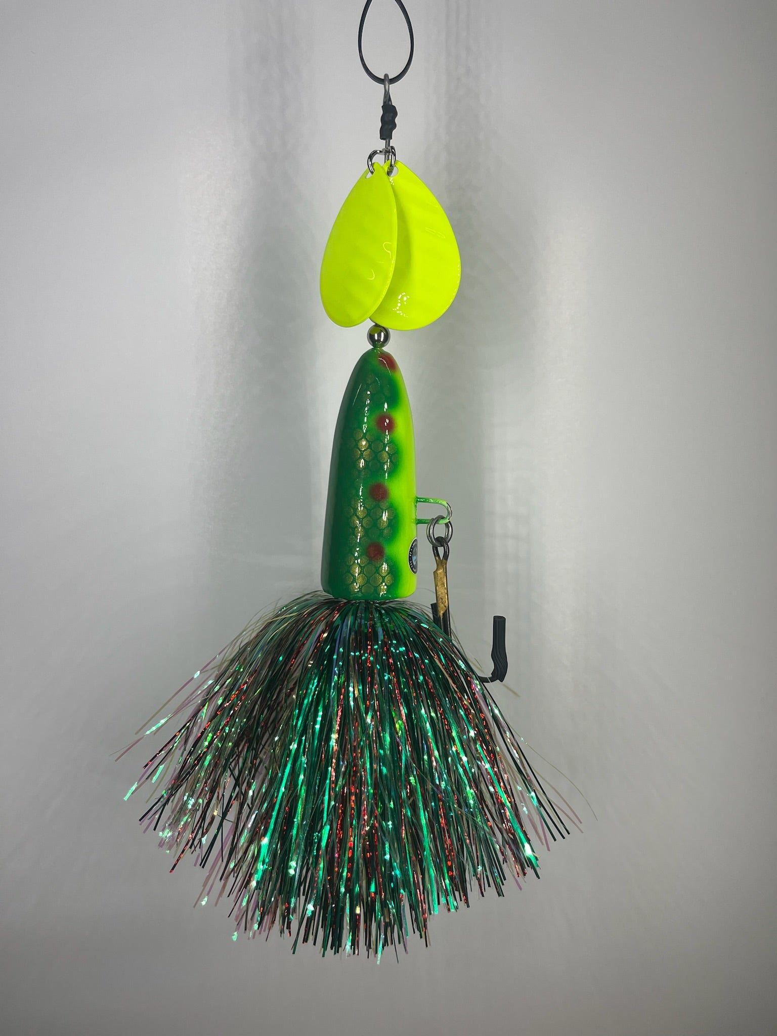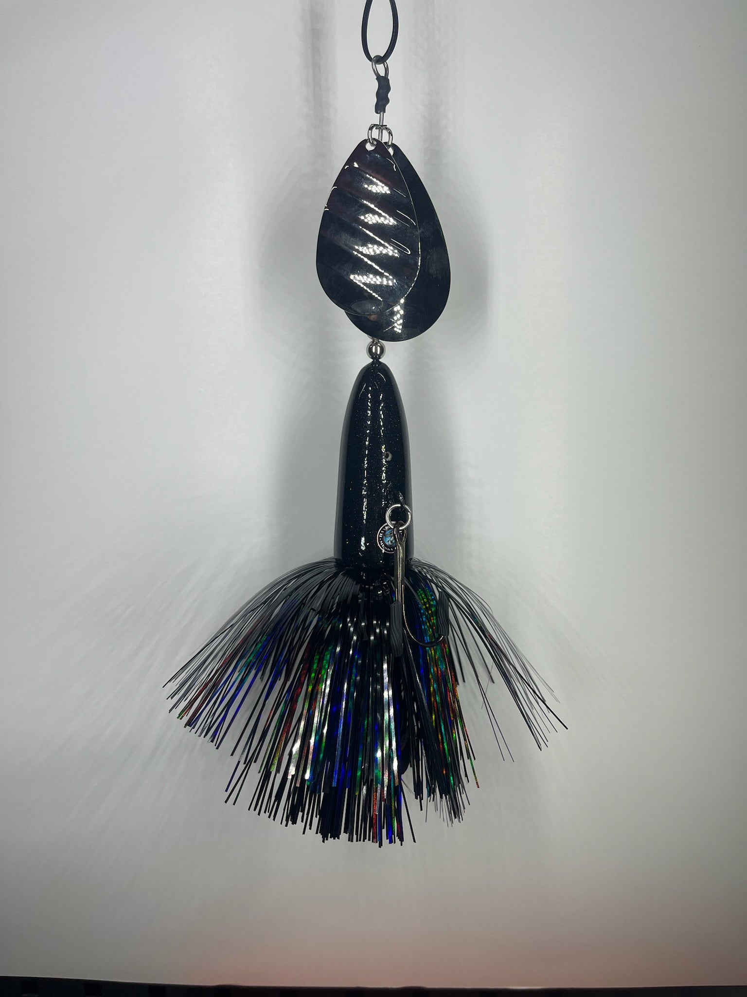 Weighted 9/10 combo were the next step in our hard body baits, these were designed to be used in open water you can use them in many depths of the water column as they have a screw insert that you can change the weights from 1/2oz to 2oz they can help reach depths not commonly fished with In-Line baits.The Weighted 10's are very easy to use when screw weights are used, the blades open up first crank of the reel and stay open in the figure 8. These baits have a solid body with a though wire we use the same 0.062 stainless steel wire that are on our other baits. These baits have one size 9 one size 10 magnum blade and two 5/0 VMC treble hook they are finished with a flashabou hand tied by us. the screw insert uses a 6-32 thread which is the common thread for the industry. Adding the weights help keep line twist when trolling these baits.