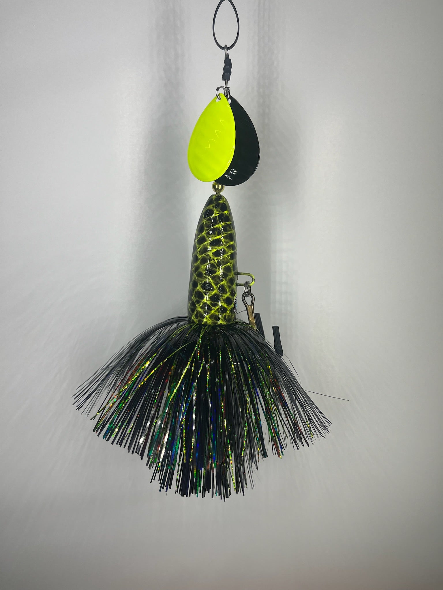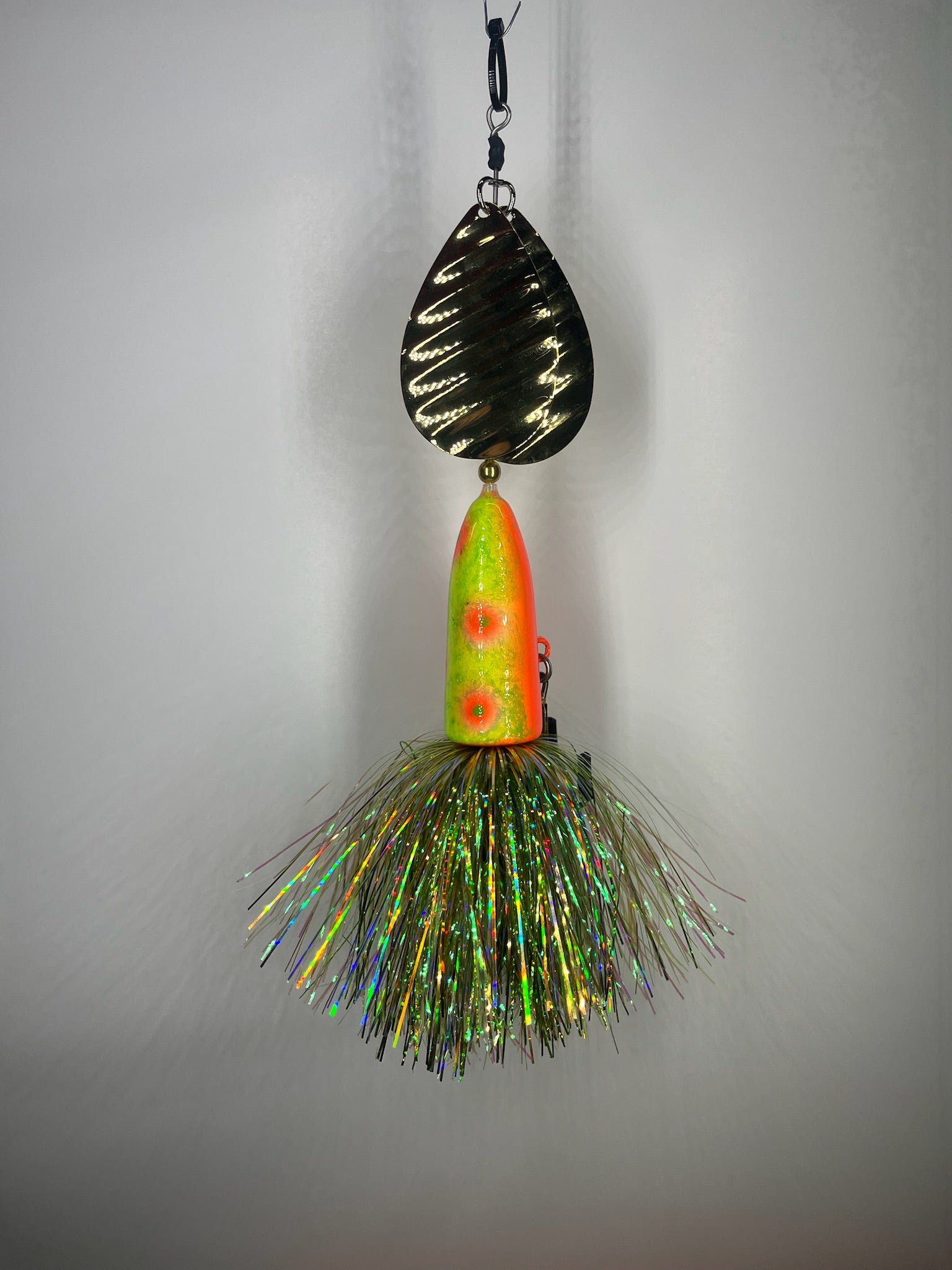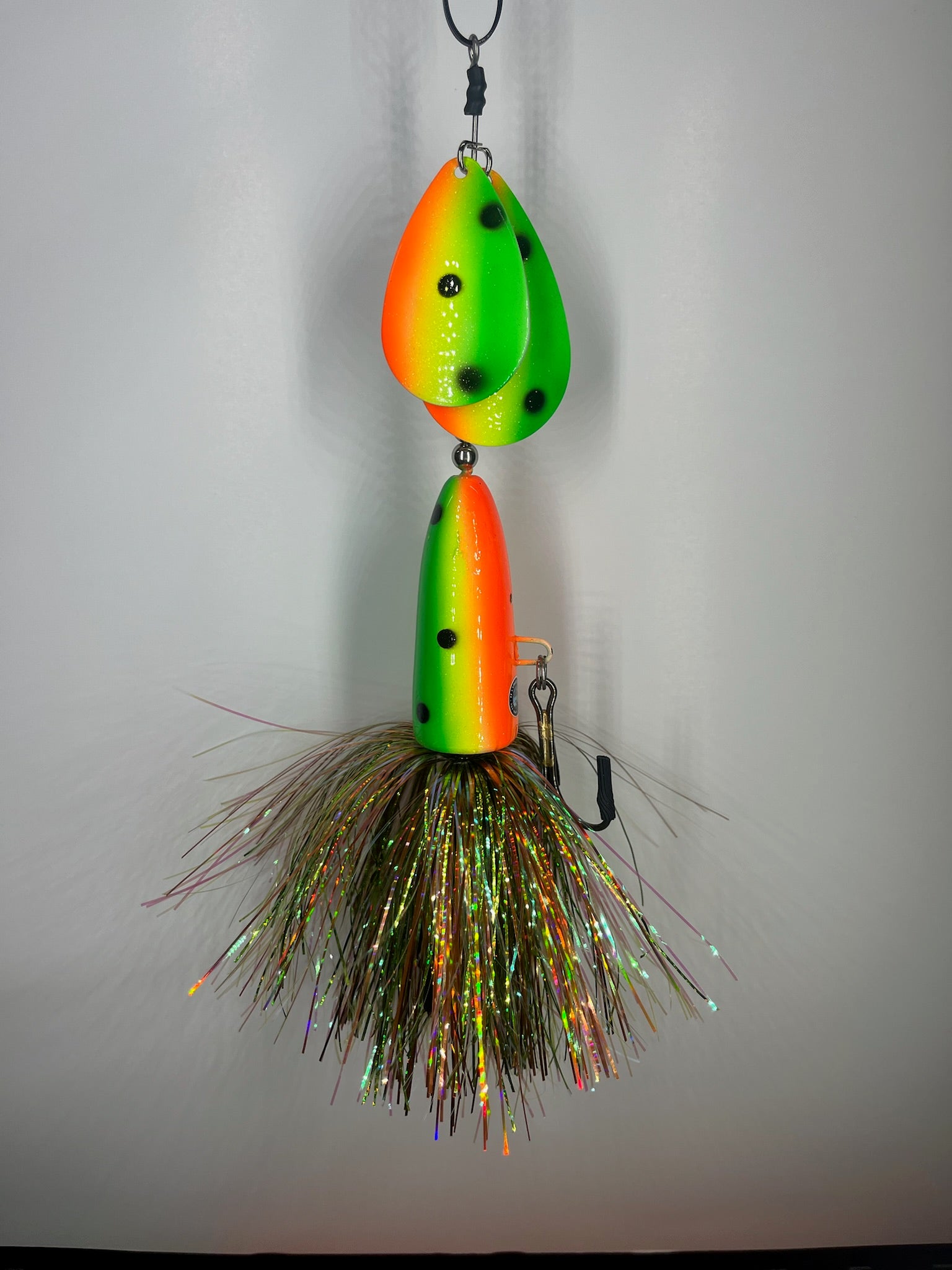 Weighted 9/10 combo were the next step in our hard body baits, these were designed to be used in open water you can use them in many depths of the water column as they have a screw insert that you can change the weights from 1/2oz to 2oz they can help reach depths not commonly fished with In-Line baits.The Weighted 10's are very easy to use when screw weights are used, the blades open up first crank of the reel and stay open in the figure 8. These baits have a solid body with a though wire we use the same 0.062 stainless steel wire that are on our other baits. These baits have one size 9 one size 10 magnum blade and two 5/0 VMC treble hook they are finished with a flashabou hand tied by us. the screw insert uses a 6-32 thread which is the common thread for the industry. Adding the weights help keep line twist when trolling these baits.